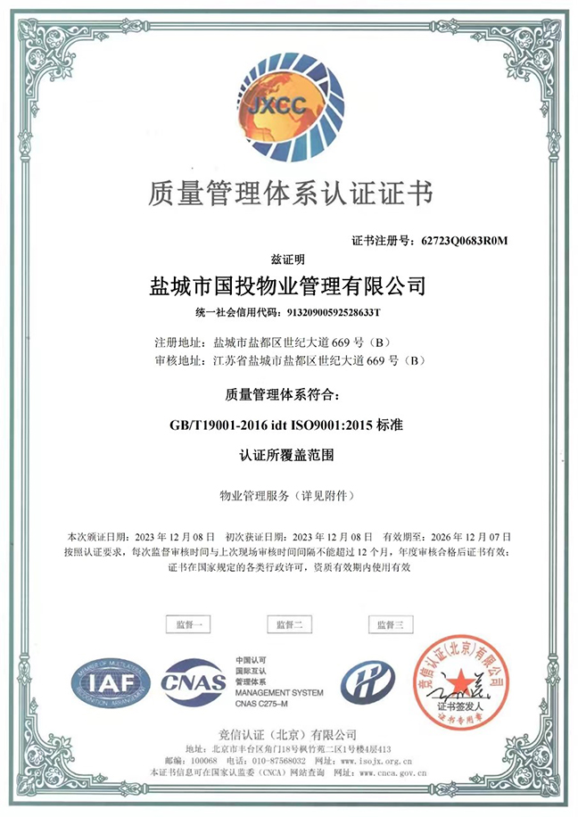 日前,鹽城國投物業(yè)公司順利取得ISO“三體系”(ISO9001質(zhì)量管理體系、ISO14001環(huán)境管理體系、ISO45001職業(yè)健康安全管理體系)認證證書。這是公司在提升企業(yè)綜合實力過程中取得的新進展,標(biāo)志著公司在精細化、制度化、規(guī)范化管理方面邁上新臺階。