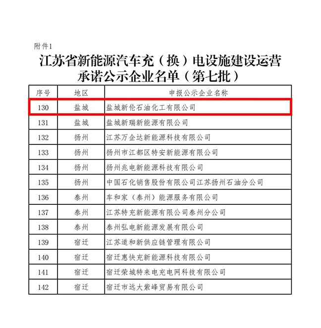 日前,省工信廳發(fā)布了《江蘇省新能源汽車充(換)電設(shè)施建設(shè)運(yùn)營承諾公示企業(yè)(第七批)名單》,鹽城新倫石化公司榜上有名,正式納入我省電動汽車充電設(shè)施運(yùn)營服務(wù)商目錄。